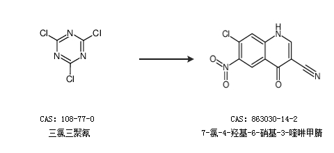 1.通過三氯三聚氰合成7-氯-4-羥基-6-硝基-3-喹啉甲腈