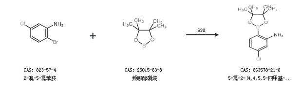 1.通過(guò)2-溴-5-氯苯胺和頻哪醇硼烷合成5-氯-2-(4,4,5,5-四甲基-1,3,2-二氧硼烷)-苯胺,收率約63%;