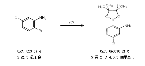 2.通過(guò)2-溴-5-氯苯胺合成5-氯-2-(4,4,5,5-四甲基-1,3,2-二氧硼烷)-苯胺,收率約96%;