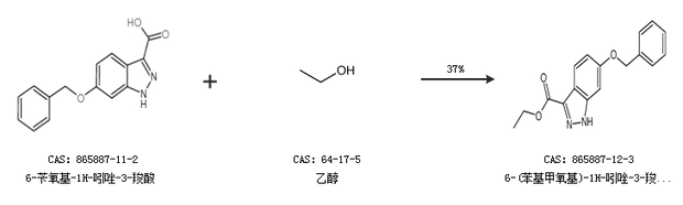 1.通過(guò)6-芐氧基-1H-吲唑-3-羧酸和乙醇合成6-(苯基甲氧基)-1H-吲唑-3-羧酸乙酯,收率約37%;
