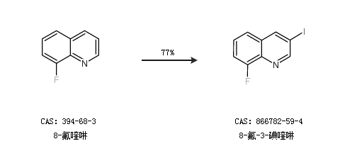 1.通過8-氟喹啉合成8-氟-3-碘喹啉,收率約77%;