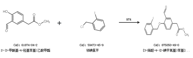 1.通過2-(3-甲?;?4-羥基苯基)乙酸甲酯和鄰碘氯芐合成[3-烯醛-4-(2-碘芐氧基)苯基]乙酸甲酯,收率約97%;