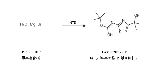1.通過甲基溴化鎂合成(4-(2-羥基丙烷-2-基)噻唑-2-基)氨基甲酸叔丁酯,收率約47%;