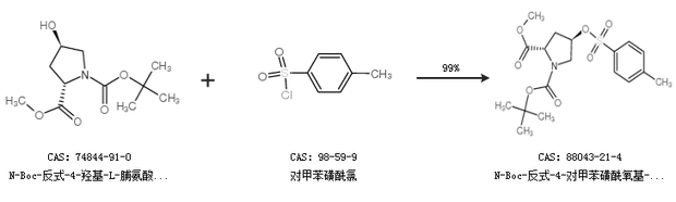 1.通過N-Boc-反式-4-羥基-L-脯氨酸甲酯和對甲苯磺酰氯合成N-Boc-反式-4-對甲苯磺酰氧基-L-脯氨酸甲酯,收率約99%;
