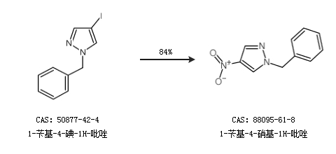 2.通過(guò)1-芐基-4-碘-1H-吡唑合成1-芐基-4-硝基-1H-吡唑,收率約84%;