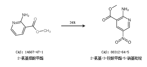 1.通過(guò)2-氨基煙酸甲酯合成2-氨基-3-羧酸甲酯-5-硝基吡啶,收率約34%;