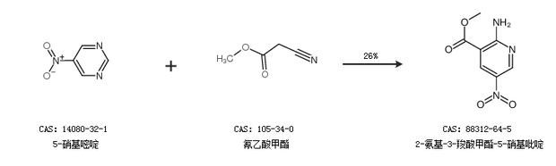 2.通過(guò)5-硝基嘧啶和氰乙酸甲酯合成2-氨基-3-羧酸甲酯-5-硝基吡啶,收率約26%;