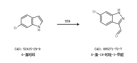 1.通過6-溴吲哚合成6-溴-1H-吲唑-3-甲醛,收率約55%;