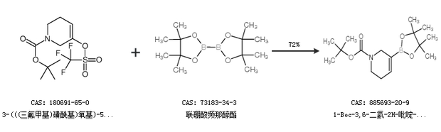 1.通過3-(((三氟甲基)磺?;?氧基)-5,6-二氫吡啶-1(2H)-羧酸叔丁酯和聯(lián)硼酸頻那醇酯合成1-Boc-3,6-二氫-2H-吡啶-5-硼酸頻哪醇酯,收率約72%;