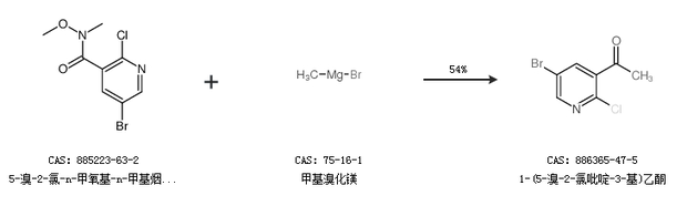 2.通過5-溴-2-氯-n-甲氧基-n-甲基煙酰胺和甲基溴化鎂合成1-(5-溴-2-氯吡啶-3-基)乙酮,收率約54%;