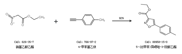 1.通過硝基乙酸乙酯和4-甲苯基乙炔合成5-(對甲苯)異噁唑-3-羧酸乙酯,收率約92%;