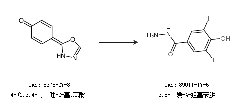 1.通過4-(1,3,4-噁二唑-2-基)苯酚合成3,5-二碘-4-羥基芐肼