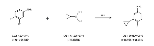 1.通過3-溴-4-氟苯胺和環(huán)丙基硼酸合成3-環(huán)丙基-4-氟苯胺,收率約65%;