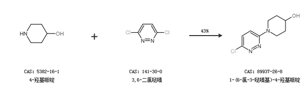 1.通過4-羥基哌啶和3,6-二氯噠嗪合成1-(6-氯-3-噠嗪基)-4-羥基哌啶,收率約43%;