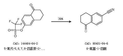 1.通過5-氧代-5,6,7,8-四氫萘-2-基 三氟甲烷磺酸合成6-氰基-1-四酮,收率約39%;