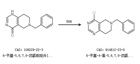 1.通過6-芐基-5,6,7,8-四氫吡啶并[4,3-d]嘧啶-4(3H)-酮合成6-芐基-4-氯-5,6,7,8-四氫吡啶并[4,3-d]嘧啶,收率約58%;
