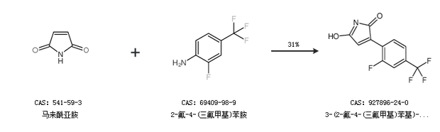 1.通過(guò)馬來(lái)酰亞胺和2-氟-4-(三氟甲基)苯胺合成3-(2-氟-4-(三氟甲基)苯基)-1H-吡咯-2,5-二酮,收率約31%;