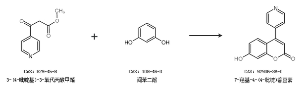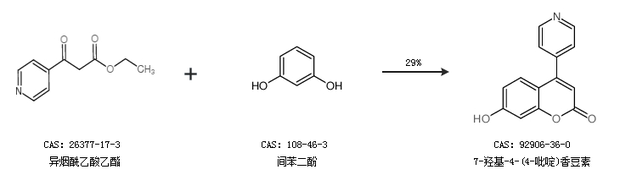 1.通過(guò)異煙酰乙酸乙酯和間苯二酚合成7-羥基-4-(4-吡啶)香豆素,收率約29%;