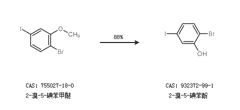 1.通過2-溴-5-碘苯甲醚合成2-溴-5-碘苯酚,收率約88%;