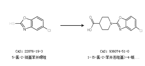 1.通過5-氯-2-巰基苯并噁唑合成1-(5-氯-2-苯并惡唑基)-4-哌啶羧酸