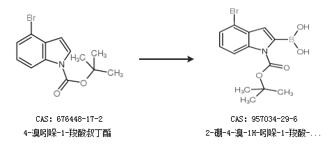 1.通過4-溴吲哚-1-羧酸叔丁酯合成2-硼-4-溴-1H-吲哚-1-羧酸-1-(1,1-二甲基乙基)酯