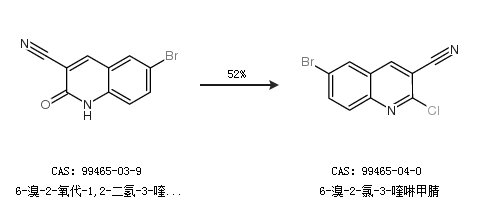 1.通過6-溴-2-氧代-1,2-二氫-3-喹啉甲腈合成6-溴-2-氯-3-喹啉甲腈,收率約52%;