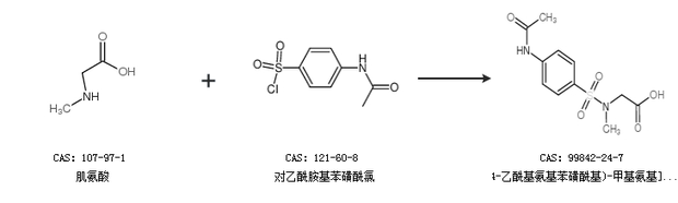 1.通過肌氨酸和對乙酰胺基苯磺酰氯合成(4-乙?;被交酋;?-甲基氨基]-乙酸