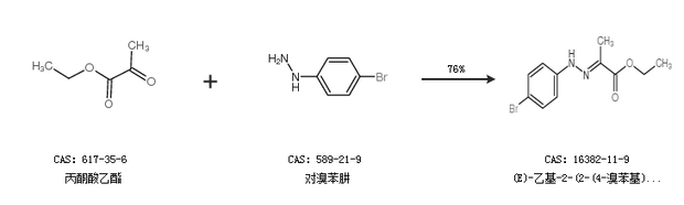 1.通過丙酮酸乙酯和對溴苯肼合成(E)-乙基-2-(2-(4-溴苯基)腙基)丙酸酯,收率約76%;