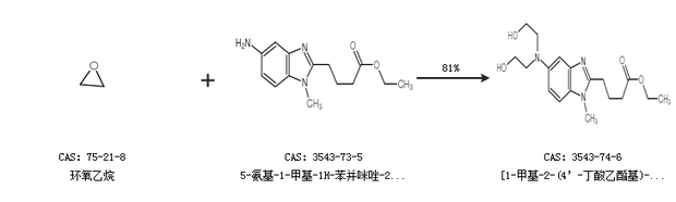 1.通過(guò)環(huán)氧乙烷和5-氨基-1-甲基-1H-苯并咪唑-2-丁酸乙酯合成[1-甲基-2-(4’-丁酸乙酯基)-5-N, N-二(2’-羥基乙基)]-1H -苯并咪唑,收率約81%;