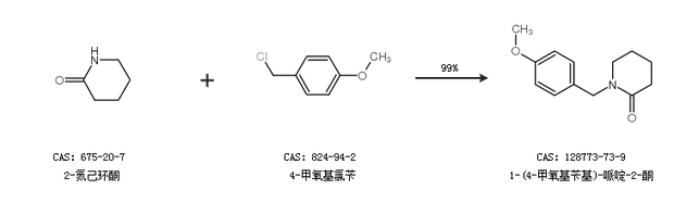 1.通過2-氮己環(huán)酮和4-甲氧基氯芐合成1-(4-甲氧基芐基)-哌啶-2-酮,收率約99%;