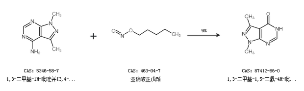 2.通過(guò)1,3-二甲基-1H-吡唑并[3,4-d]嘧啶-4-胺和亞硝酸正戊酯合成1,3-二甲基-1,5-二氫-4H-吡唑并-[3,4-d]嘧啶-4-酮,收率約9%;