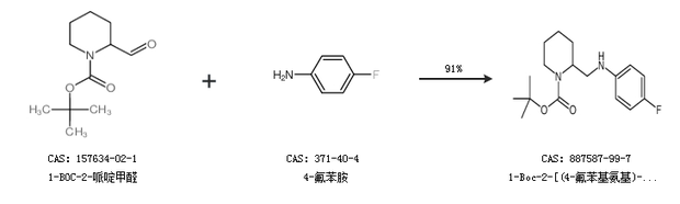 1.通過(guò)1-BOC-2-哌啶甲醛和4-氟苯胺合成1-Boc-2-[(4-氟苯基氨基)-甲基]-哌啶,收率約91%;