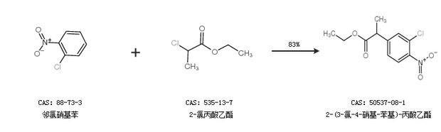 1.通過鄰氯硝基苯和2-氯丙酸乙酯合成2-(3-氯-4-硝基-苯基)-丙酸乙酯,收率約83%;