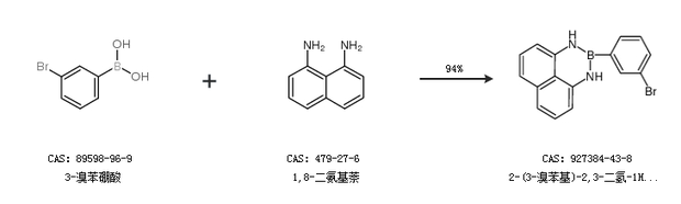 1.通過(guò)3-溴苯硼酸和1,8-二氨基萘合成2-(3-溴苯基)-2,3-二氫-1H-萘并[1,8-de][1,3,2]二氮雜硼烷,收率約94%;