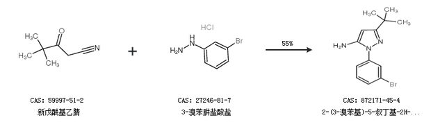 1.通過新戊?;译婧?-溴苯肼鹽酸鹽合成2-(3-溴苯基)-5-叔丁基-2H-吡唑-3-胺,收率約55%;