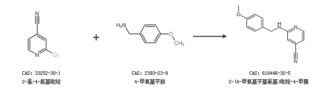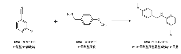 2.通過4-氰基-2-氟吡啶和4-甲氧基芐胺合成2-(4-甲氧基芐基氨基)吡啶-4-甲腈