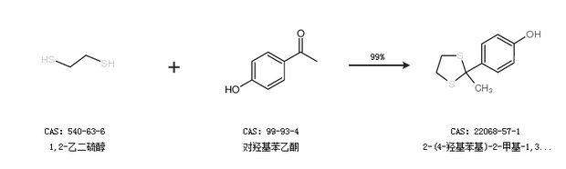 1.通過(guò)1,2-乙二硫醇和對(duì)羥基苯乙酮合成2-(4-羥基苯基)-2-甲基-1,3-二硫烷,收率約99%;
