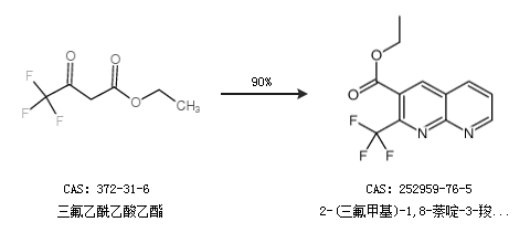 1.通過(guò)三氟乙酰乙酸乙酯合成2-(三氟甲基)-1,8-萘啶-3-羧酸乙酯,收率約90%;
