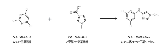 1.通過(guò)2,4,6-三氯嘧啶和1-甲基-4-硝基咪唑合成2,6-二氯-N-(1-甲基-1H-咪唑-4-基)嘧啶-4-胺