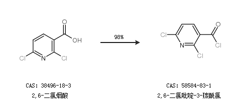1.通過(guò)2,6-二氯煙酸合成2,6-二氯吡啶-3-羰酰氯,收率約98%;