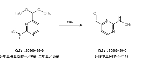 1.通過2-甲基氨基嘧啶-4-羧醛 二甲基乙縮醛合成2-胺甲基嘧啶-4-甲醛,收率約58%;