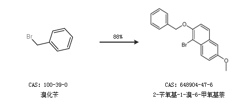 1.通過(guò)溴化芐合成2-芐氧基-1-溴-6-甲氧基萘,收率約88%;