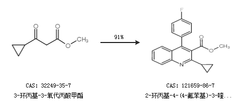 2.通過3-環(huán)丙基-3-氧代丙酸甲酯合成2-環(huán)丙基-4-(4-氟苯基)-3-喹啉羧酸甲酯,收率約91%;