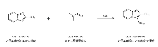 1.通過(guò)2-甲基咪唑并[1,2-a]吡啶和N,N-二甲基甲酰胺合成2-甲基吲哚[1,2-A]吡啶-3-甲醛,收率約65%;