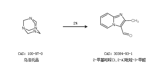 2.通過(guò)烏洛托品合成2-甲基吲哚[1,2-A]吡啶-3-甲醛,收率約2%;