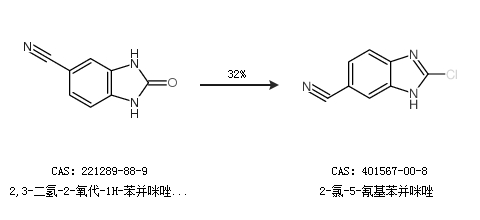 1.通過2,3-二氫-2-氧代-1H-苯并咪唑-5-甲腈合成2-氯-5-氰基苯并咪唑,收率約32%;