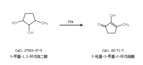 1.通過3-甲基-1,2-環(huán)戊烷二醇合成2-羥基-3-甲基-2-環(huán)戊烯酮,收率約75%;