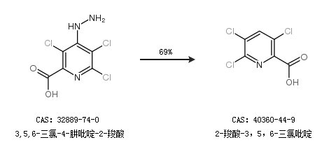 1.通過3,5,6-三氯-4-肼吡啶-2-羧酸合成2-羧酸-3,5,6-三氯吡啶,收率約69%;