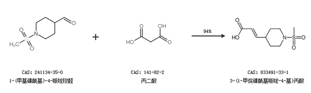 1.通過1-(甲基磺酰基)-4-哌啶羧醛和丙二酸合成3-(1-甲烷磺?;哙?4-基)丙酸,收率約94%;