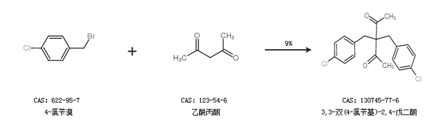 1.通過4-氯芐溴和乙酰丙酮合成3,3-雙(4-氯芐基)-2,4-戊二酮,收率約9%;